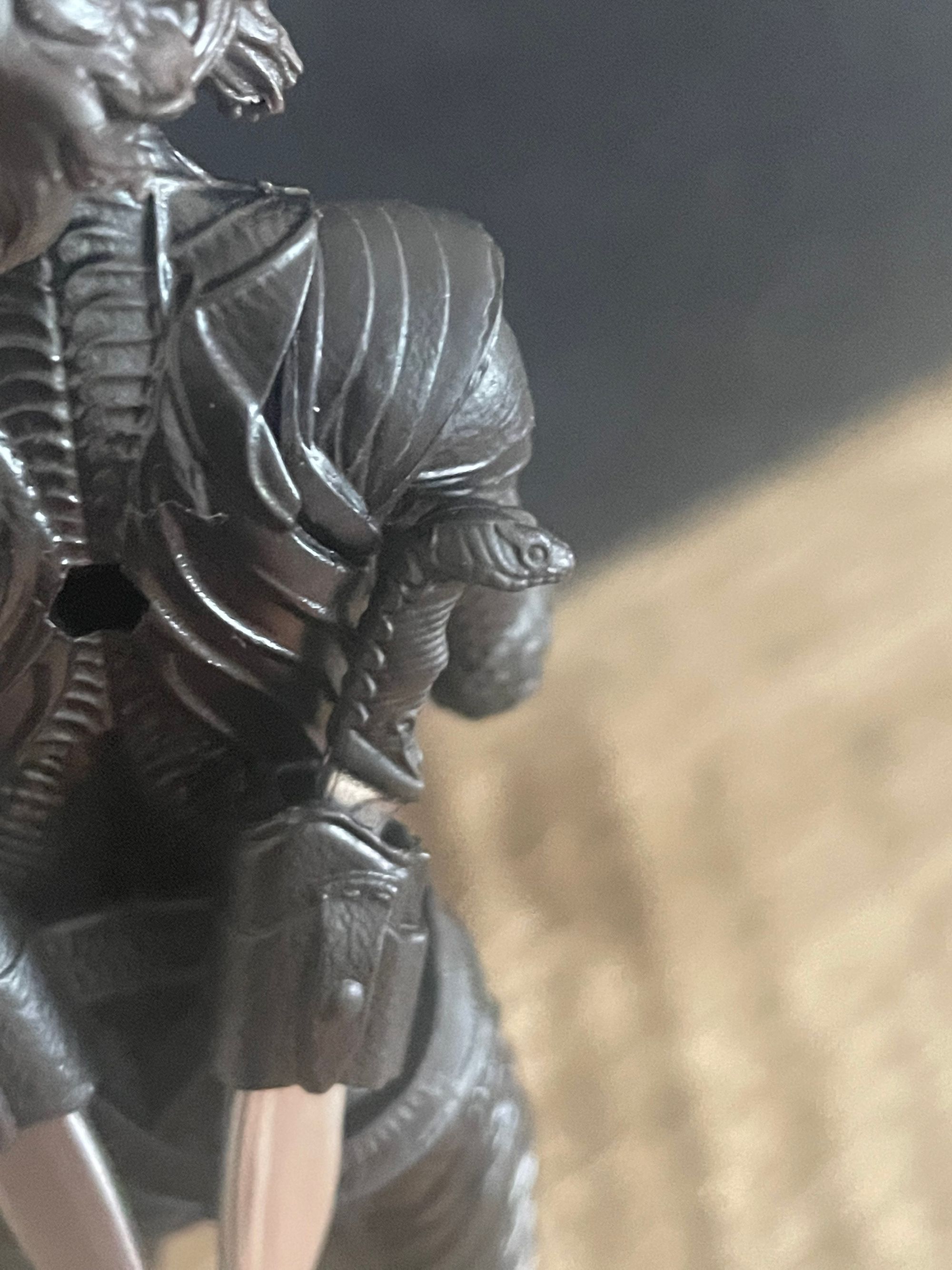 A few words about the figure: yeah, it's really cool. Her outfit is all black but has a lot of rich textures. She's stealthy AND fashionable. The large COBRA insignia on her belt looks like the furthest thing from cheap. The gun has a high level of detail, and I wanted to get the suppressor into focus, because the barrel looks especially menacing. She's got two blades called kukris with handles resembling snakes, and they fit into her belt at the back: