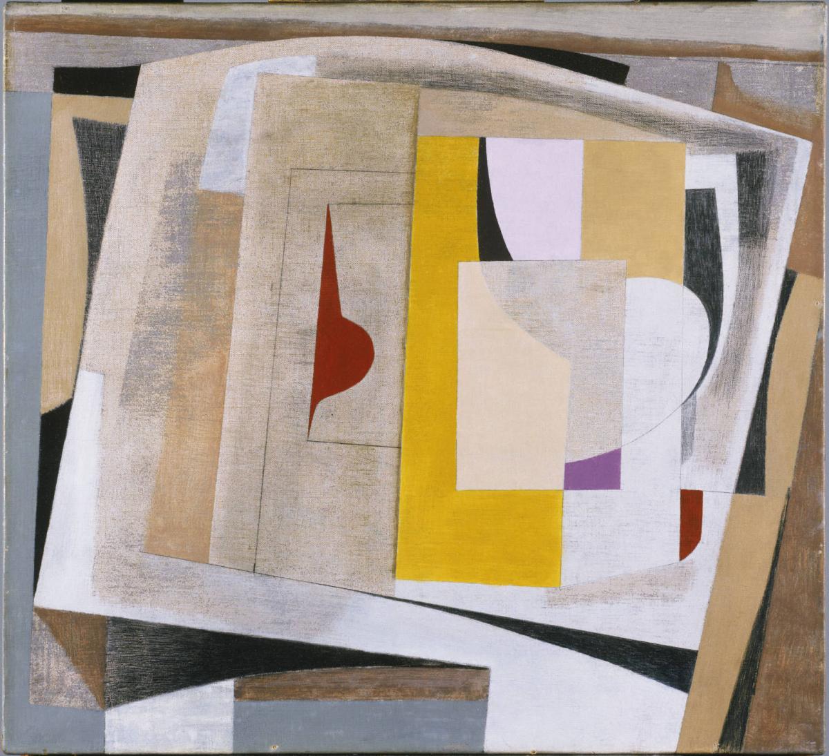 "March 17 1950 (still life)" can be said to scramble the forms of a traditional still life. The blues, browns, and rectangular shapes give a powerful hint of a furnished room. I prefer to think of it as a scrambled dining scene. Johanna Halford-Macleod points to the “translucent, overlapping layers” of paint (156). The white flag-like object has light tan and blue-gray coloring on its left; on its right, a white sheen covers but does not conceal a bright yellow square and what seems part of a filled wine glass. These colorations remind me of how cloth carries light: a blue napkin, perhaps, or a thin curtain. The white flag, on second thought, resembles more a tablecloth.
