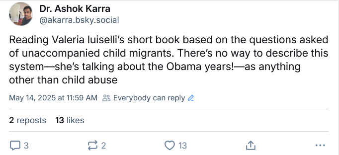 Yesterday I sat in my school's library and read Valeria Luiselli's Tell Me How It Ends: An Essay In Forty Questions. As I worked through it, I posted on Bluesky about its unsparing depiction of how the U.S. treats refugees; you can read that thread here if you like: