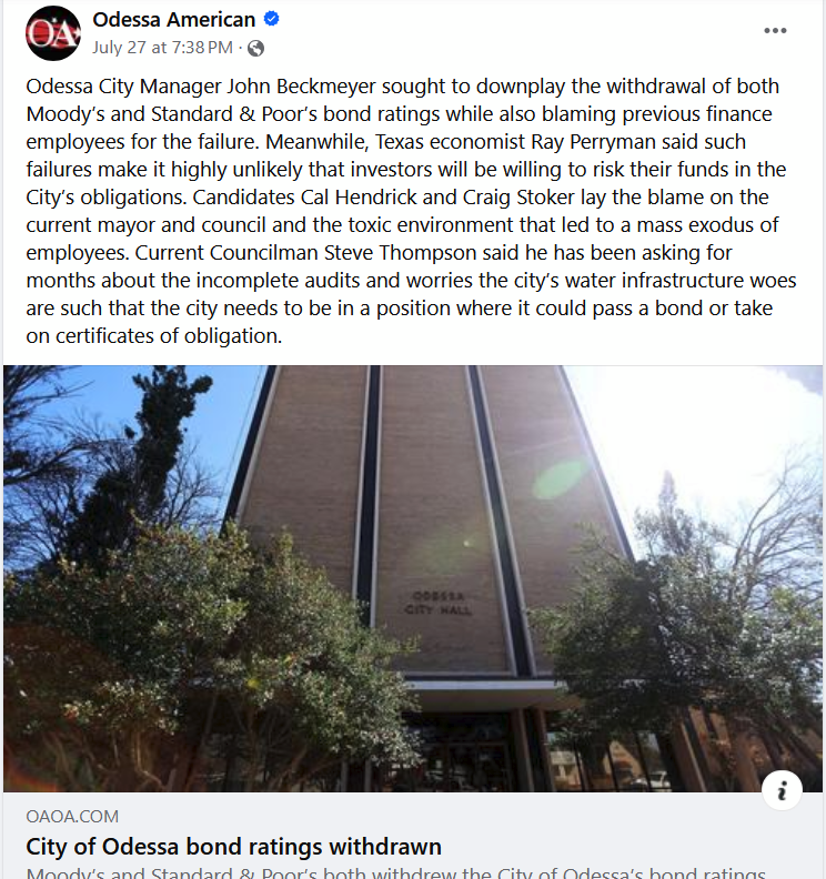 The city didn't complete audits for 2 years (!!) and thus lacks a rating on its bonds. This puts critical infrastructure updates on hold (expect more boil notices, if downtown doesn't flood again), and as you can see, a current administrator would rather blame everyone else than take responsibility. It should not surprise you that in Odessa the word "Democrat" is thrown around like an insult and, relatedly, non-partisanship is almost inconceivable nowadays.