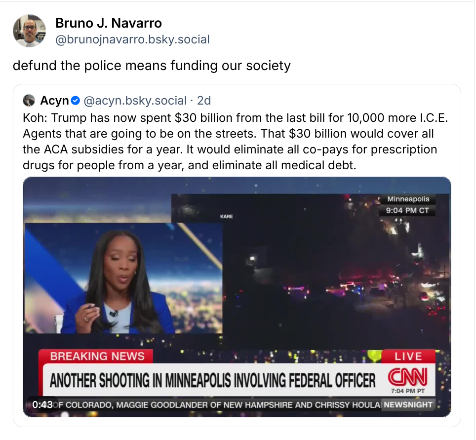 Even before discussing how the police have been used historically, which is to protect imperial and class interests, you can see that the concept of policing is problematic. This isn't to say people shouldn't be respectful of each other or observe rules. But if you want someone with a gun to take your neighbor away for no reason, you are making up rules and asking the world to confirm to your imagination. The cops, then, serve the people who use them. There is simply no way to have a democratic society or a free country if there is constant recourse to violence workers. A fair conclusion is that yes, you need something to deal with rapists and murderers and those who won't stop hurting others. But you can't put 30-70% of a given city's budget into that, then have a sheriff's department, then have county police, have state police, have federal forces. You must defund the police. They are meant for emergencies and if you keep throwing money at them, you're saying everything is an emergency all the time. That's not true and it hurts people by drowning out every real expression of need. As Bruno J. Navarro on Bluesky noted, "defund the police means funding our society:"