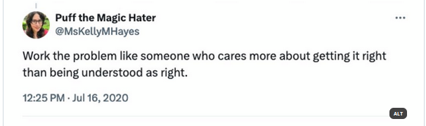 Kelly Hayes: "Work the problem like someone who cares more about getting it right than being understood as right."